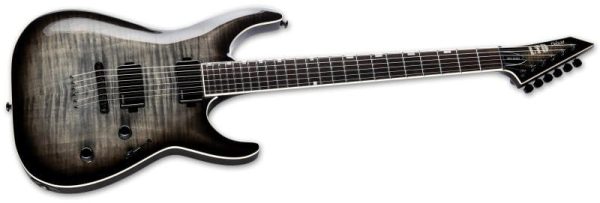 The LTD MH Series combines design elements of ESP’s H/Horizon models, like its archtop body, and from the M/Mirage guitars, like its inline headstock and extra-thin u-shaped neck. The result is a guitar that can do no wrong for any style of music. The MH-1000NT features set-thru construction at 25.5” scale, allowing for smooth and fast access to the highest frets. It offers a mahogany body with flamed maple top, finished in a translucent Charcoal burst finish to allow the figured wood to be a highlight, with white binding on the body, neck, and reversed headstock. The MH-1000NT has a sturdy thin u-shaped three-piece maple neck, and a Macassar ebony fingerboard with offset block inlays and 24 extra-jumbo stainless steel frets. Black hardware and components on this excellent guitar include a TonePros locking TOM bridge with string thru body, LTD locking tuners, and a set of direct-mounted Fishman Fluence Modern Humbucker active pickups (ceramic in the bridge and alnico in the neck), with push-pull control to select voicings and black nickel covers to match this guitar’s outstanding aesthetics. Each pickup offers two voices. With the ceramic bridge pickup, Voice 1 is the ultimate high-output ceramic humbucker bridge pickup tone… crisp, searing crunch, tight bass with no mud, and a growl. Voice 2 delivers modern passive attack performance that has superbly organic distortion characteristics with outstanding dynamics and response. The alnico neck pickup’s Voice 1 is Fishman’s modern active high-output tone, offering the ideal active alnico sound: full, round, and boosted, but with unprecedented articulation and dynamics. Voice 2 gives you the crisp, clean and fluid neck humbucker tone you’ve always wanted.